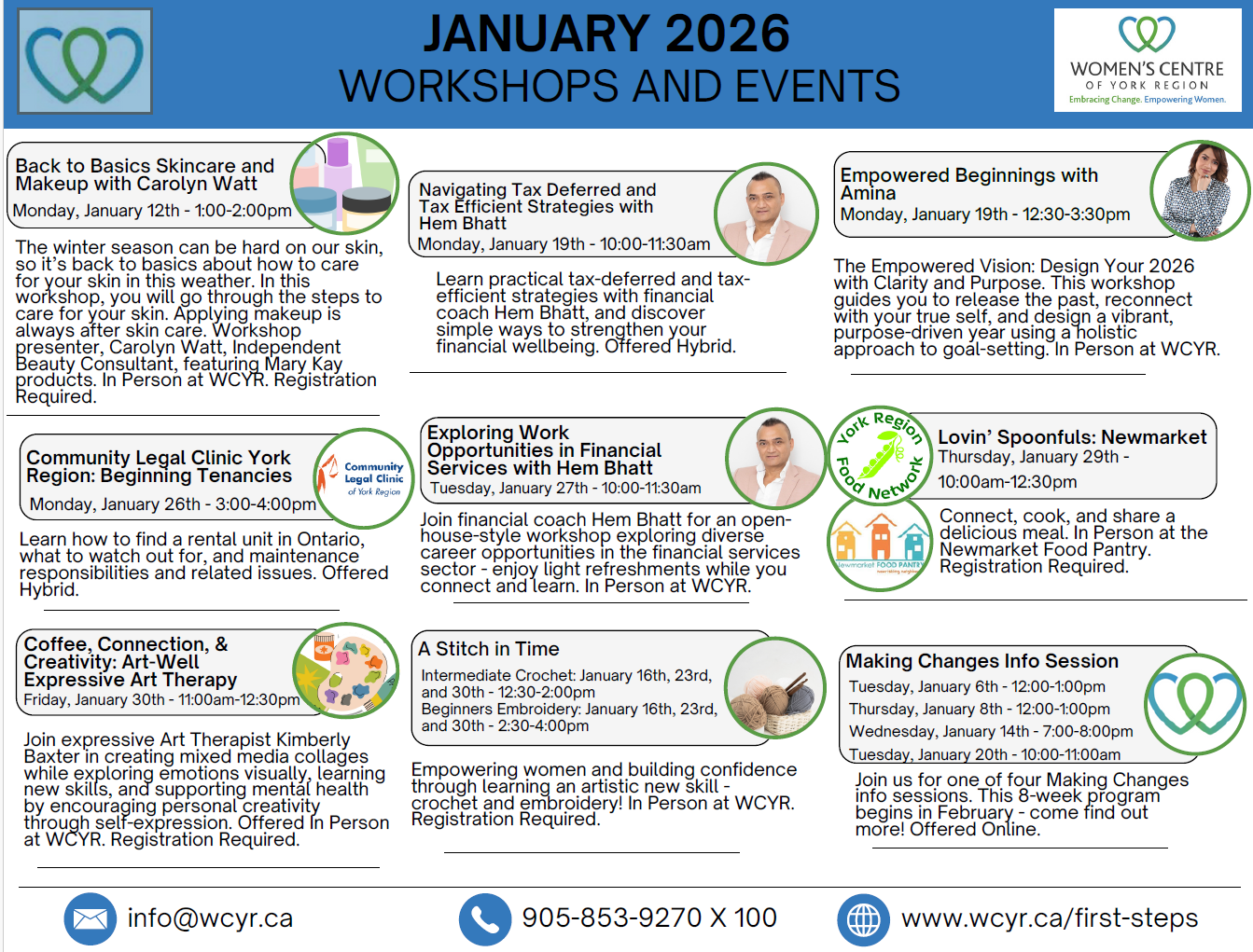 | Empowered Beginnings | Monday Janurary 19th | 12:30pm-3:30pm | In person Women's Centre of York Region |